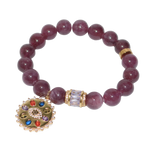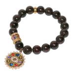 Breloque ronde sertie de cristaux multicolores sur fond doré.