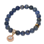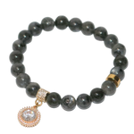 Charm rond serti de cristaux et d’une pierre centrale irisée.