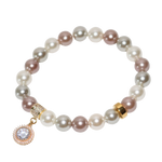 Le bracelet Mon Précieux Poudré allie des perles rosées aux reflets soyeux à un pendentif cristallin délicatement doré.