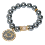 Ses perles nacrées anthracite, élégantes et profondes, contrastent avec un médaillon soleil doré — métaphore d’un cœur qui rayonne sans faillir.