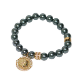 Le bracelet Louisette Full Grey marie la profondeur du gris perlé à l’élégance d’un médaillon doré inspiré des pièces anciennes.